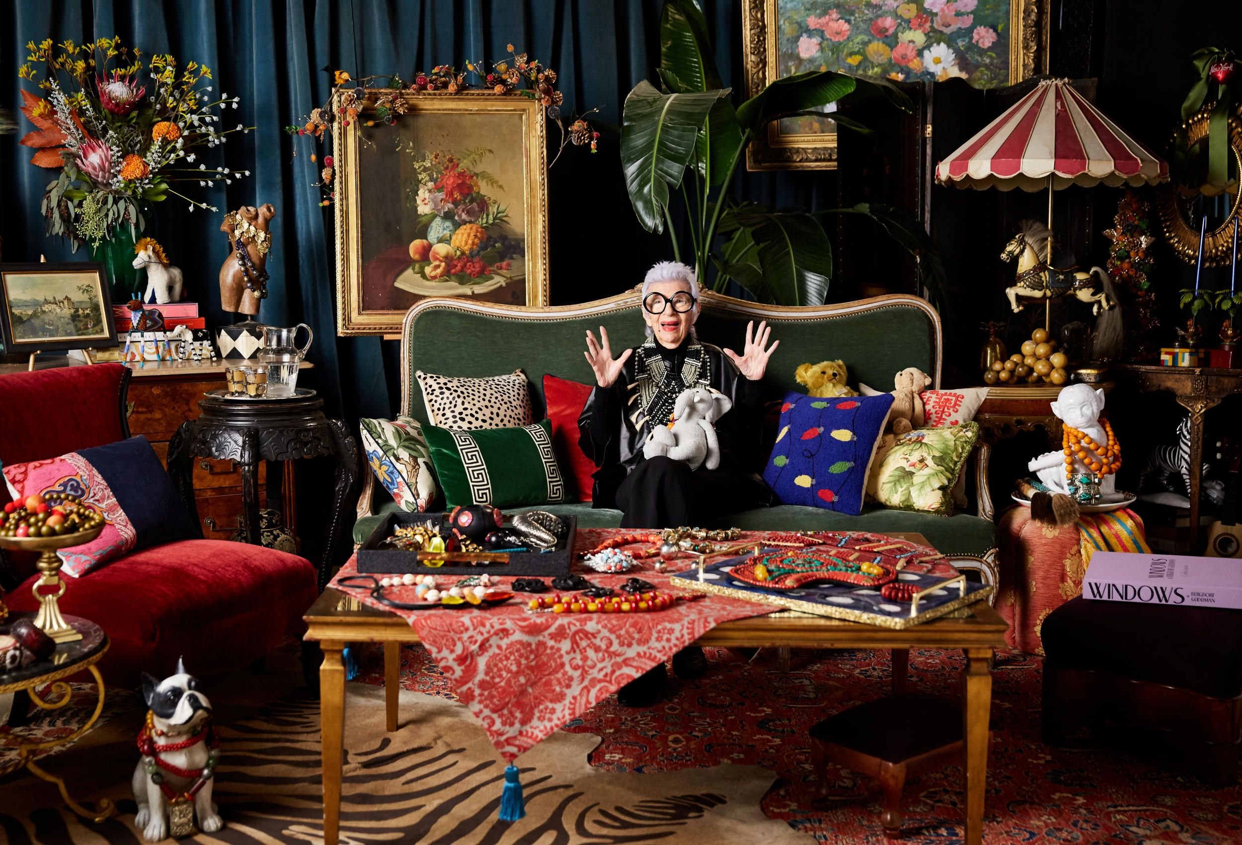 Що таке дофаміновий декор допоможе також зрозуміти історія Айріс Апфель: ця американська дизайнерка була фактично засновницею та амбасадоркою дофамінового підходу до простору, ще до того як це стало трендом. Її стиль = максималізм + колір + еклектика, що напряму описує сучасний дофаміновий дизайн. Вона міксувала текстури, принти, антикваріат і мас-маркет без правил, а її інтер’єри, як і луки, були емоційними, яскравими, “over the top.”